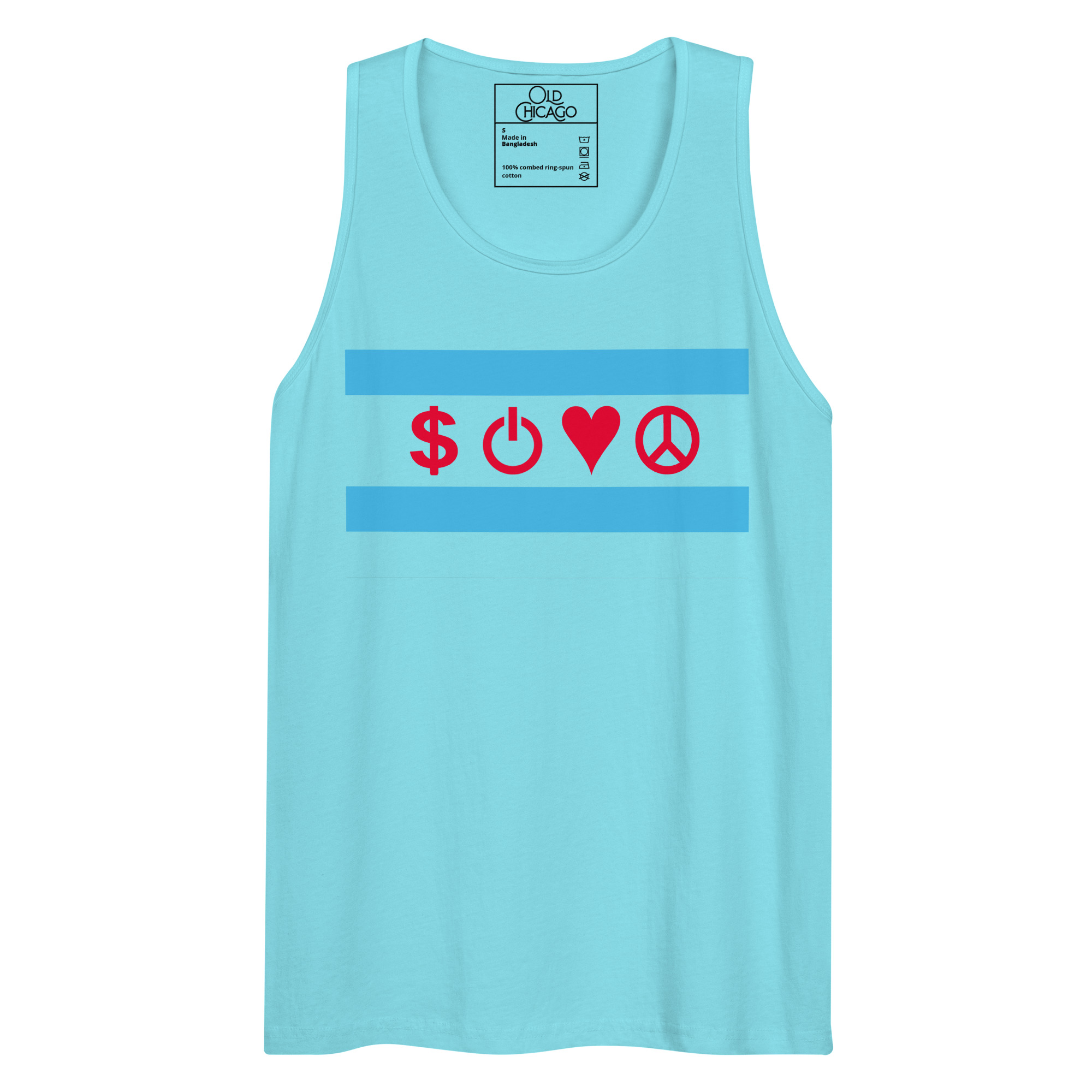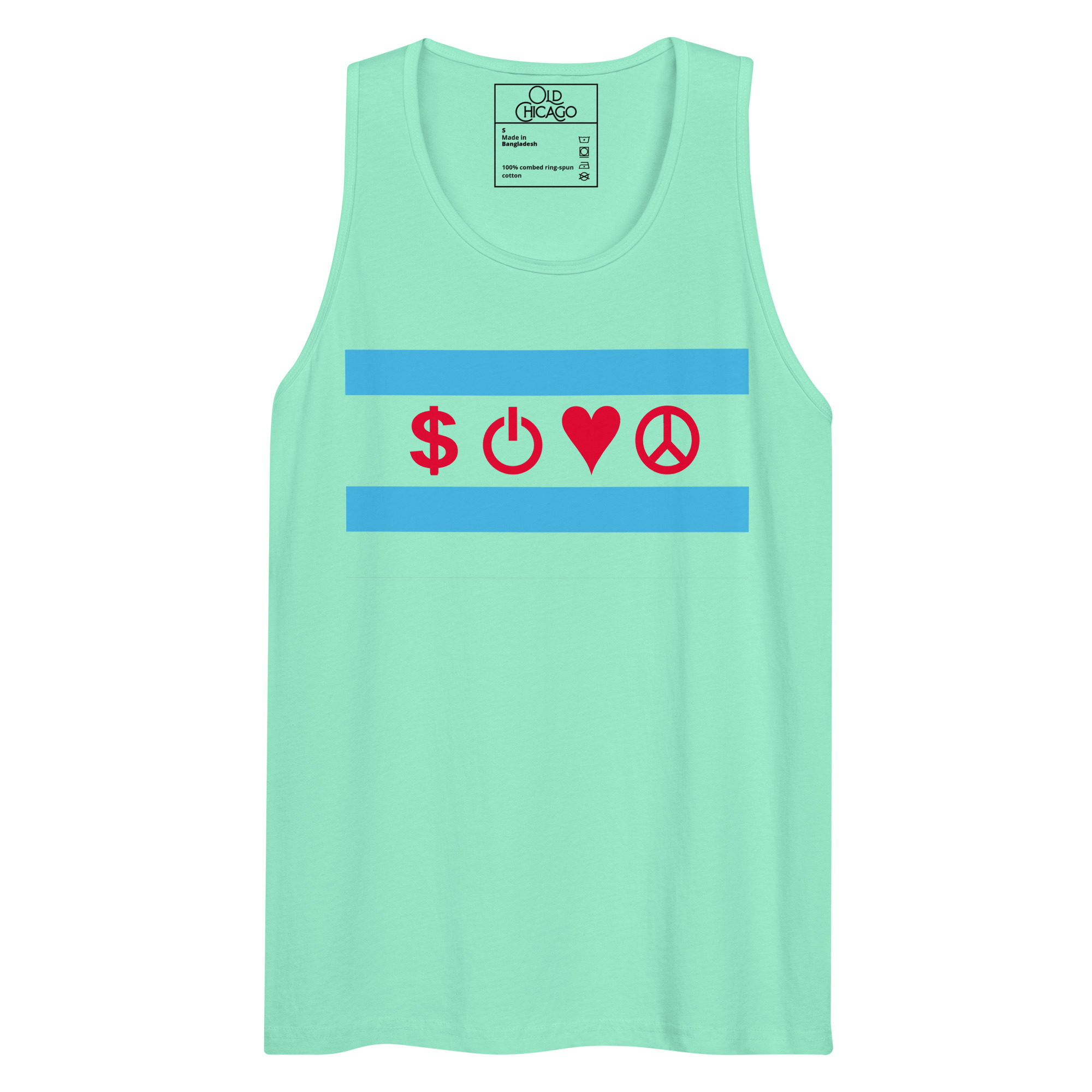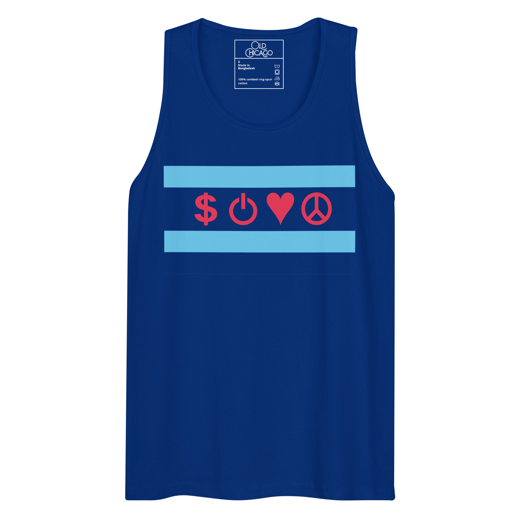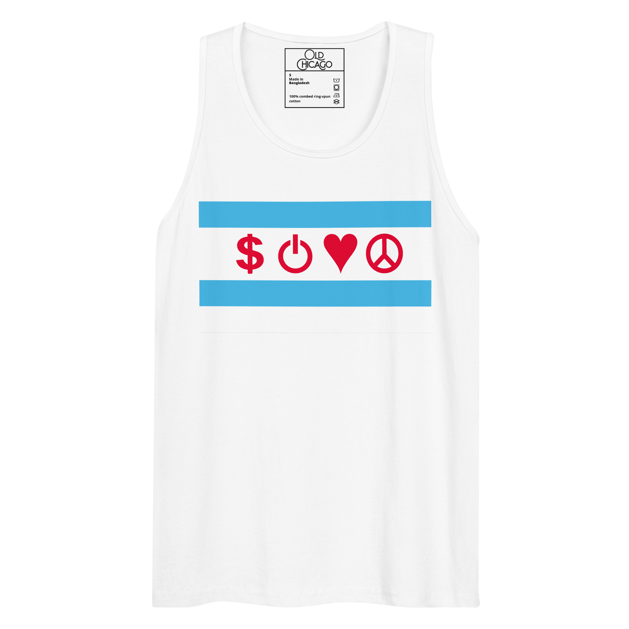 Our Symbolic Edition reimagines the flag’s four positions with universal symbols: Money ($), Power (⏻), Love (♥), and Peace (☮). Money honors the commodity exchanges and the hustle that built skyscrapers from swampland. Power represents both electrical innovation (from the World’s Fair’s White City) and political force (from the Daleys to Harold Washington to Obama). Love captures Chicago’s fierce neighborhood loyalty. Peace acknowledges both struggles and aspirations—from Jane Addams’s Hull House to modern movements for justice.