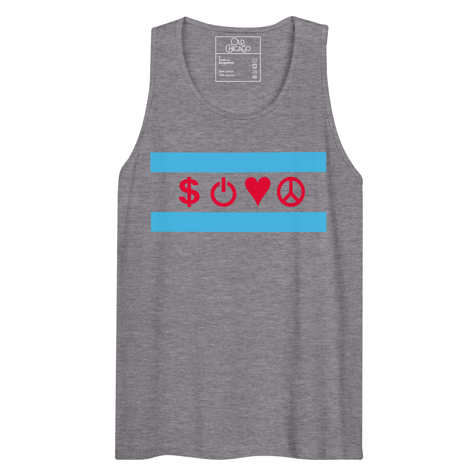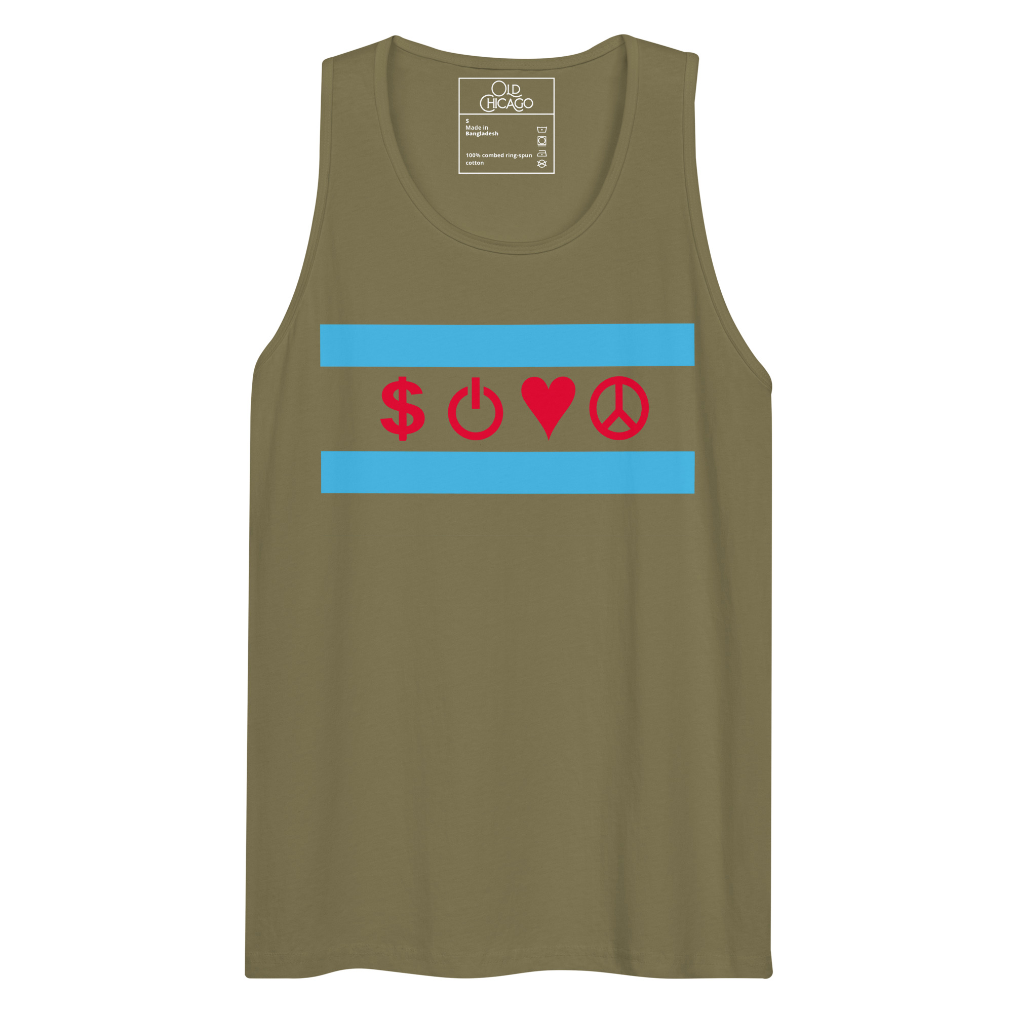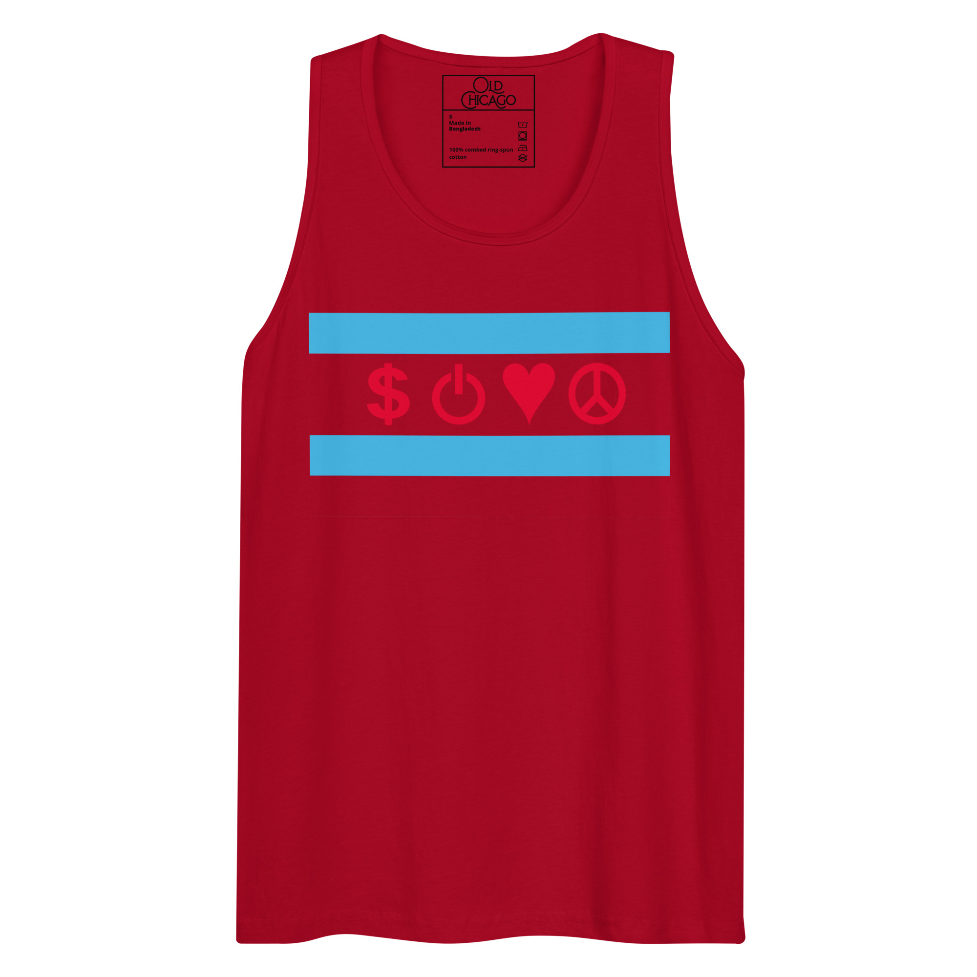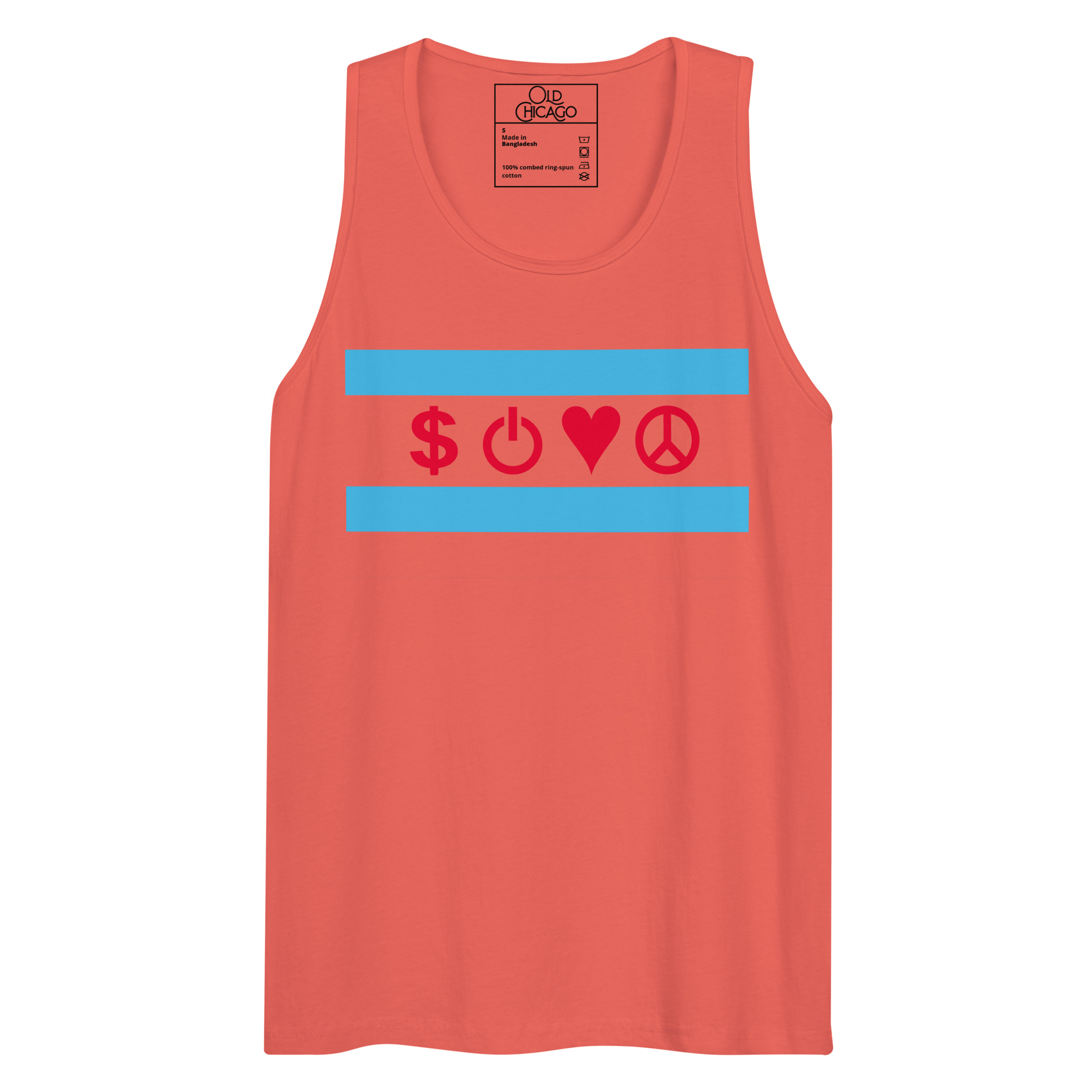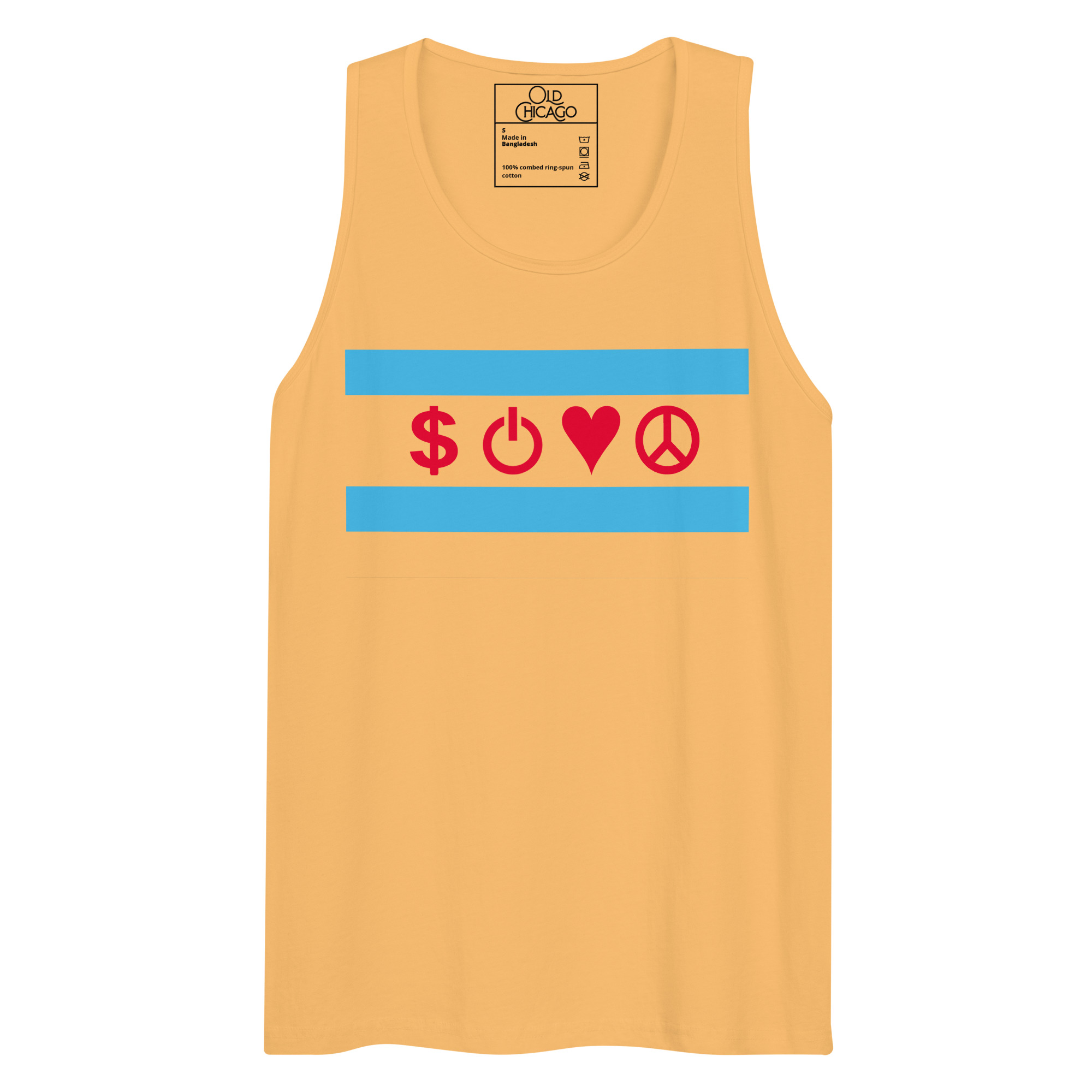 Our Symbolic Edition reimagines the flag’s four positions with universal symbols: Money ($), Power (⏻), Love (♥), and Peace (☮). Money honors the commodity exchanges and the hustle that built skyscrapers from swampland. Power represents both electrical innovation (from the World’s Fair’s White City) and political force (from the Daleys to Harold Washington to Obama). Love captures Chicago’s fierce neighborhood loyalty. Peace acknowledges both struggles and aspirations—from Jane Addams’s Hull House to modern movements for justice.